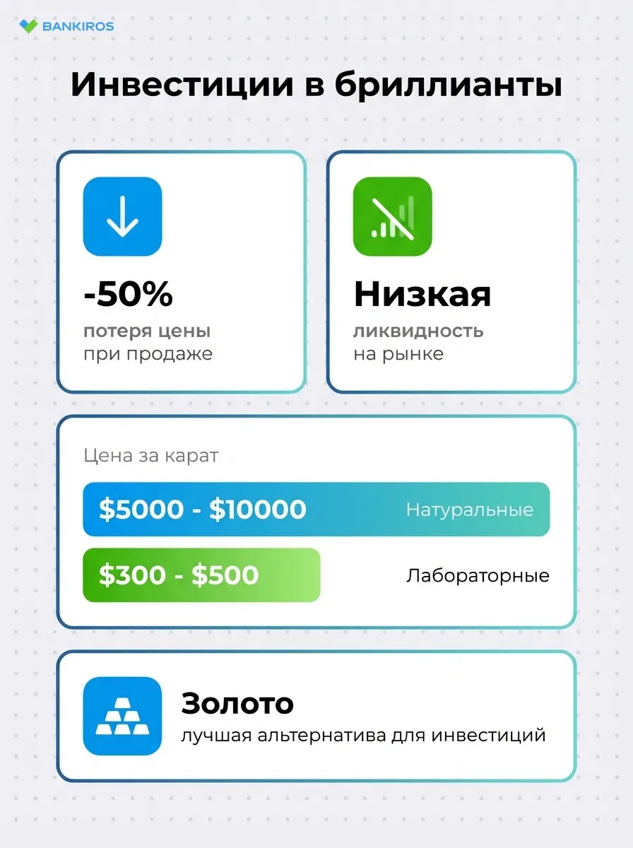 - Главная проблема – низкая ликвидность: продать бриллиант за пределами России практически невозможно, а внутри страны цена часто падает до 50% от первоначальной;