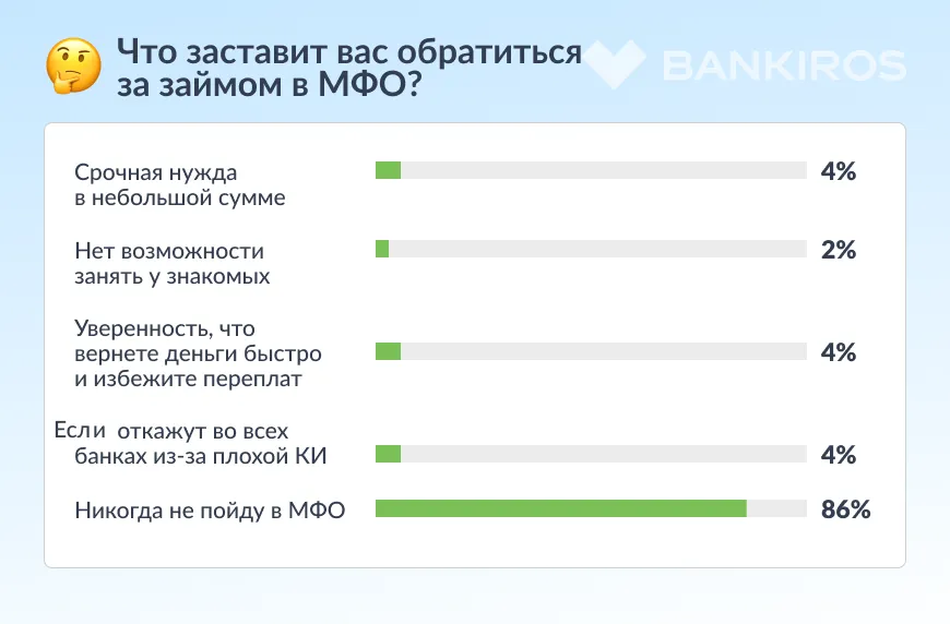 Bankiros.ru узнал у читателей, что заставит их обратиться в МФО. Опрос проходил в Телеграм-канале Bankiros.ru. Всего в исследовании приняло участие 782 человека.