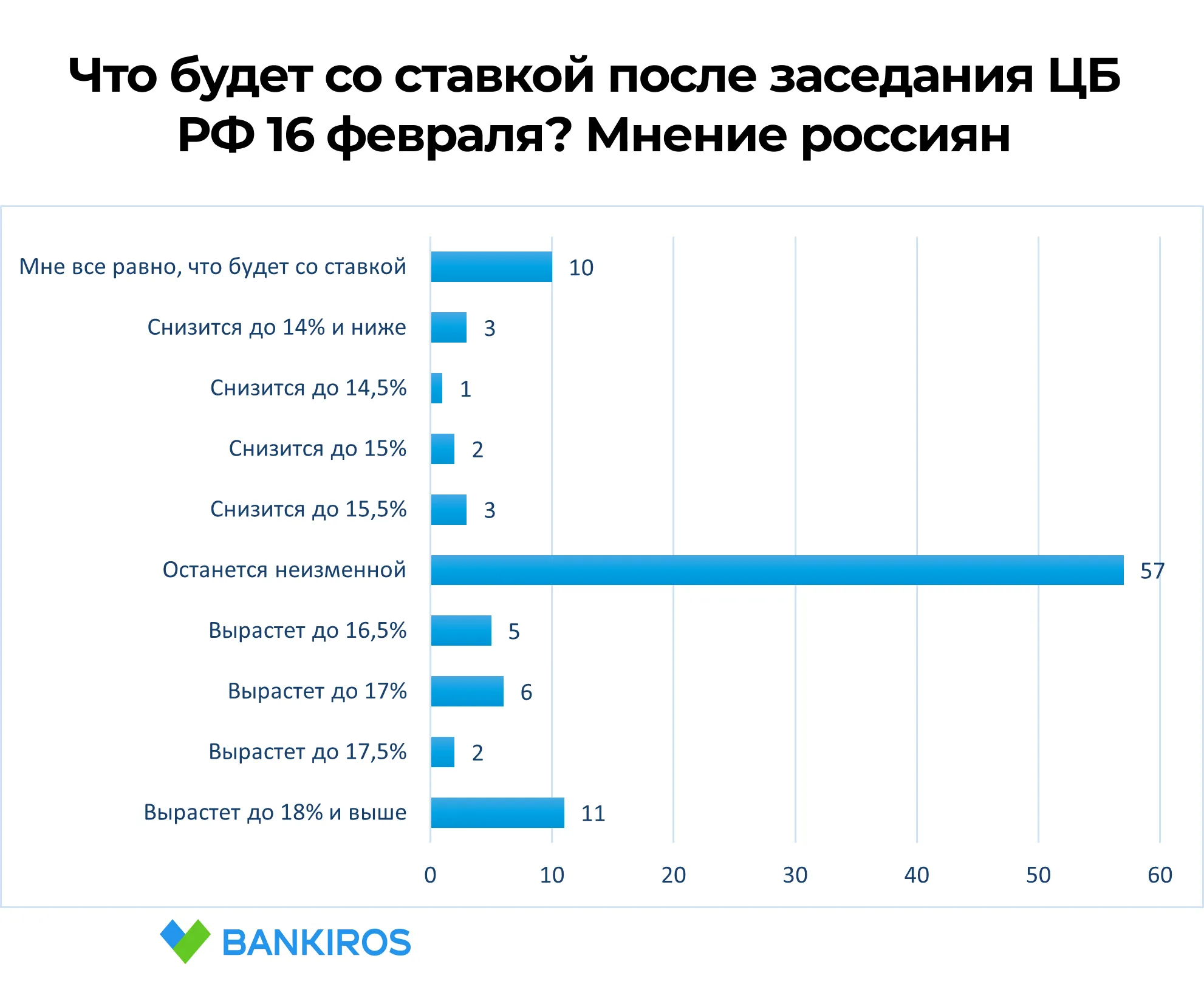 С 12 по 15 февраля Bankiros.ru провел анонимный опрос с единственным вариантом ответа в своем телеграм-канале, в котором приняли участие 2 210 читателей. Респондентов спросили, что будет с ключевой ставкой после заседания ЦБ РФ 16 февраля.