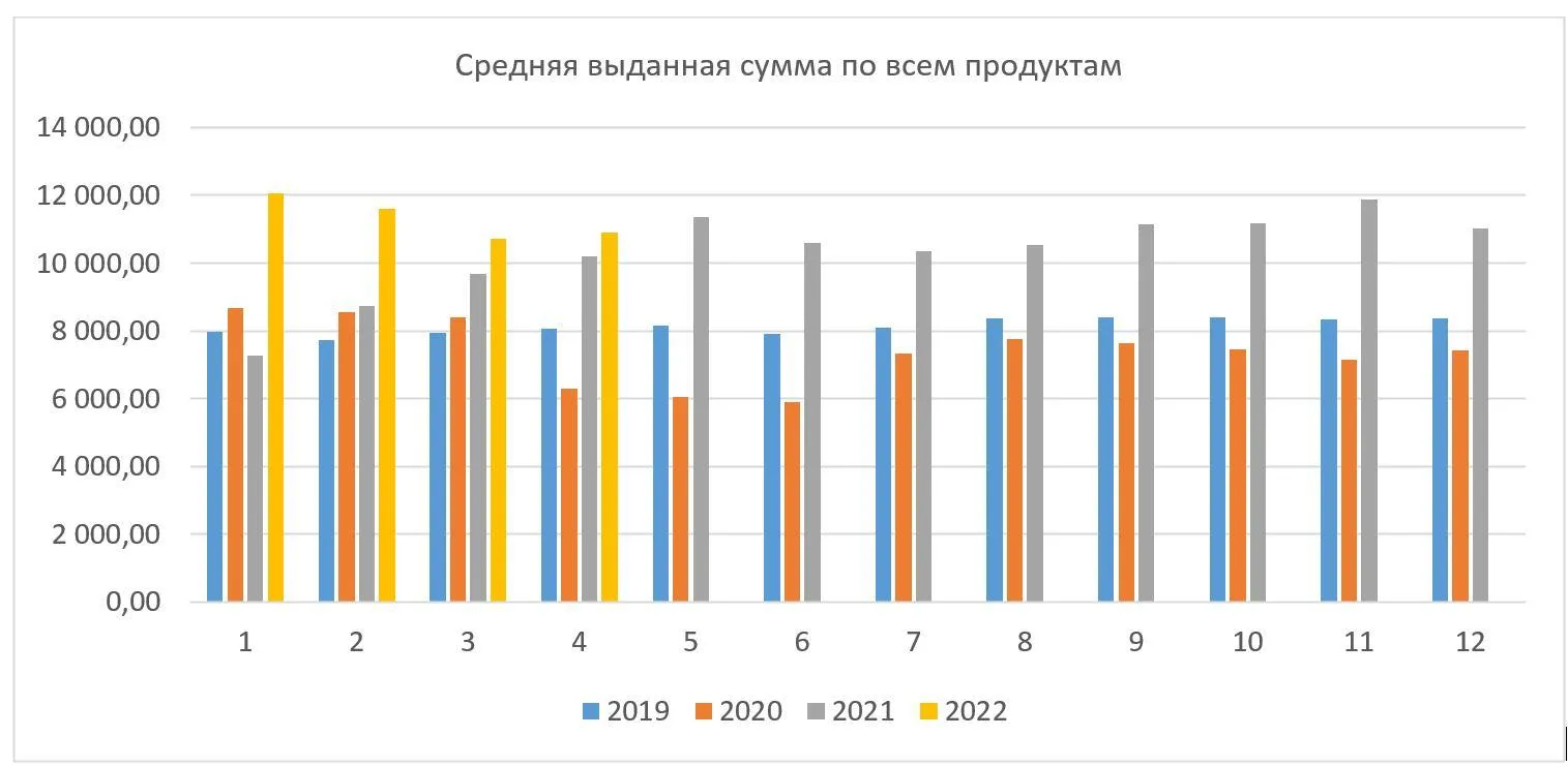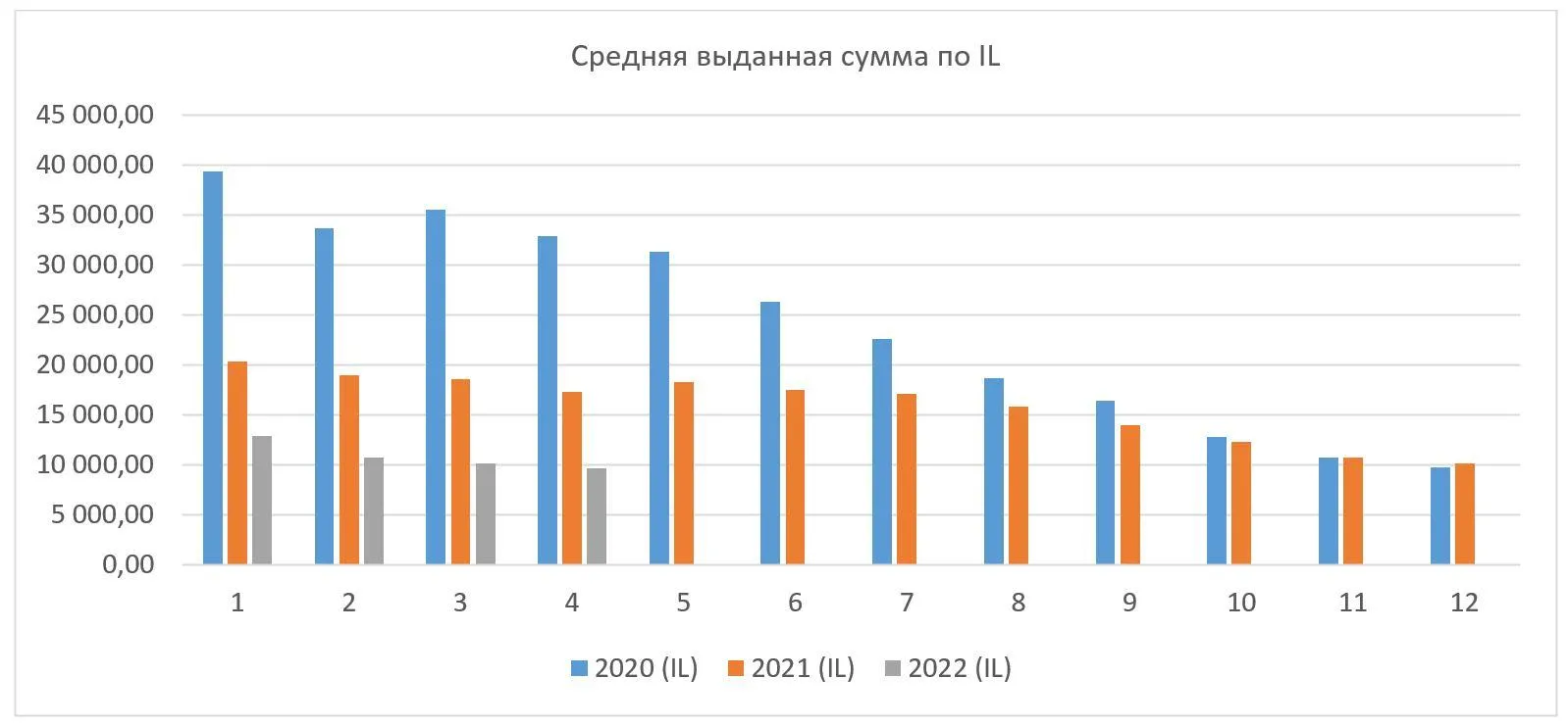 Средняя выданная сумма по PDL в 2019 году составляла 10 400 рублей, в начале пандемии снизилась до 8 500 рублей, но в 2021 и 2022 годах уже перешла планку в 11 000 рублей. Что касается IL, то в 2020 году средняя сумма по ним составляла 24 000 рублей, а в 2021 — упала до 16 000 рублей. В целом же самая популярная и одобряемая сумма — 10 000 рублей.
