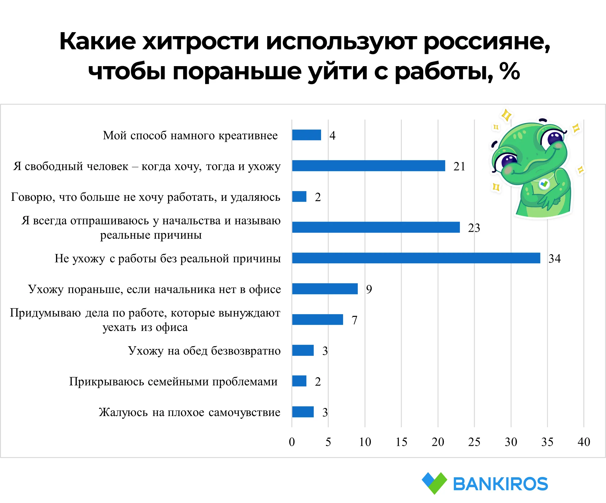 Большинство работников (34%) оказались добросовестными и заявили, что никогда не уходят с работы без уважительной причины. 23% опрошенных отметили, что всегда отпрашиваются у начальства, если нужно уйти из офиса до окончания рабочего дня, и называют реальный повод.