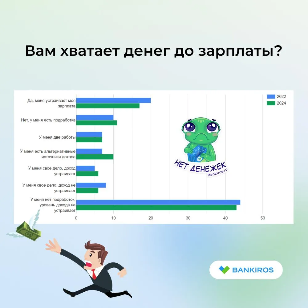 В октябре 2022 года мы провели опрос в нашем Телеграм-канале и спросили, хватает ли подписчикам денег с зарплаты. Тогда 44% опрошенных признались, что имеют лишь один источник дохода, и денежных средств им не хватает. Изменилось ли положение дел за два года? Bankiros.ru провел опрос повторно, чтобы узнать ответ на этот вопрос.