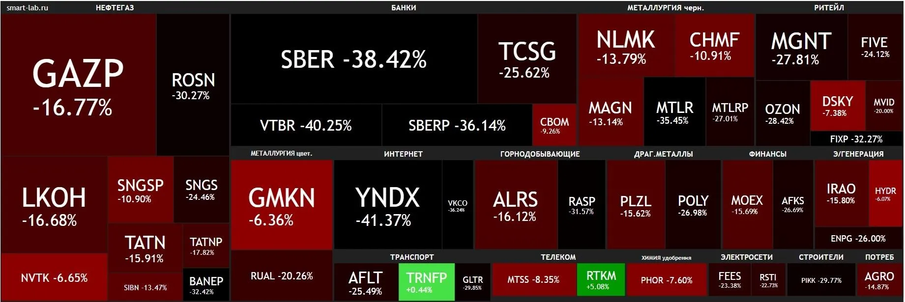 Накануне, 28 февраля, стоимость бумаг российских компаний на торгах Лондонской биржи резко обвалилась: бумаги «Новатэк» снизились на 54%, «Роснефти» – 45,51%, X5 Group – 36,25%, «Сургутнефтегаза» – 19%, Evraz – 18%, «Полюс» – 17%. В моменте котировки падали до 70%.