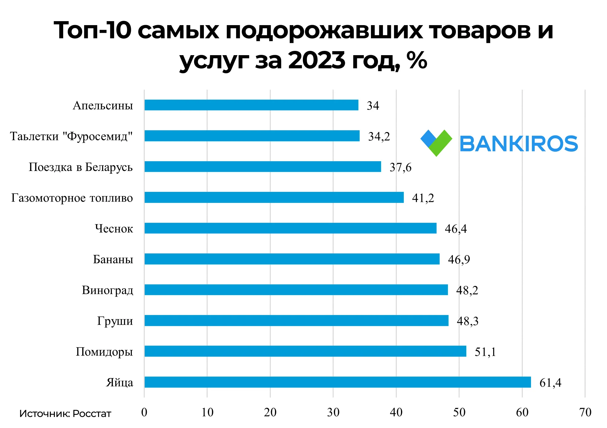 Из топ-10 самых подорожавших товаров семь позиций относятся к продуктам. В тройке лидеров – помидоры (+51,1%) и груши (+48,3%). Более чем на 40% выросли цены на виноград, бананы и чеснок.