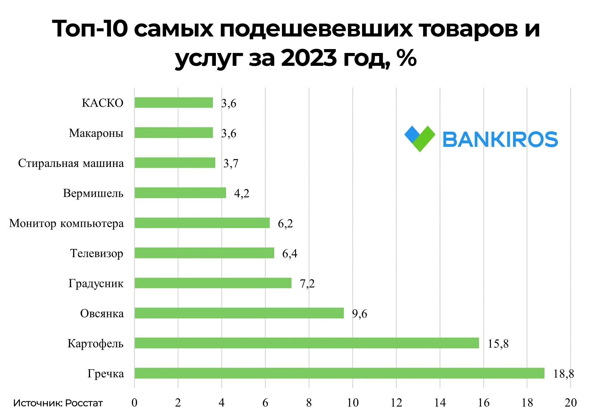 В пятерку лидеров также вошли и непродовольственные товары – градусник (-7,2%) и телевизор (-6,4%). Однако падение цен этих товаров не смогло обогнать инфляцию.