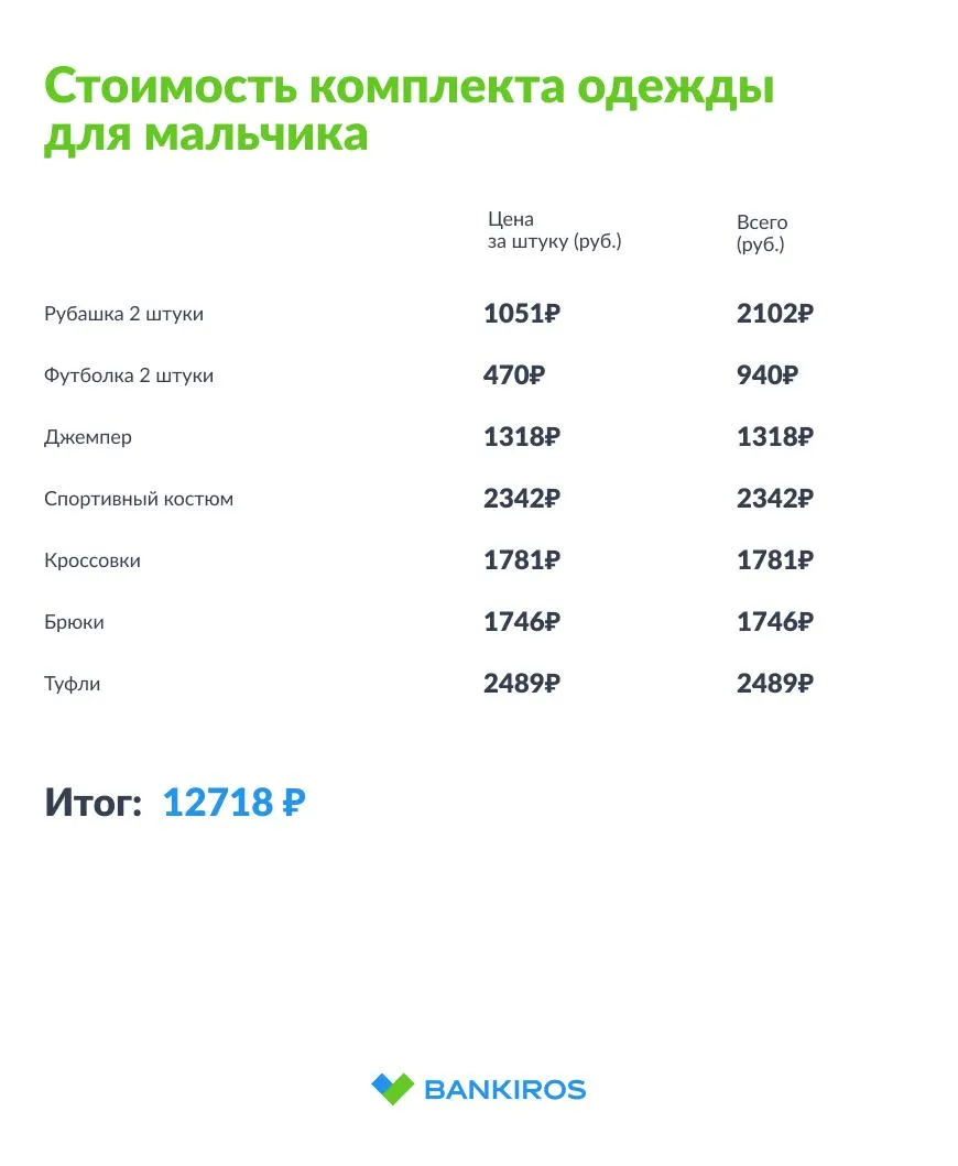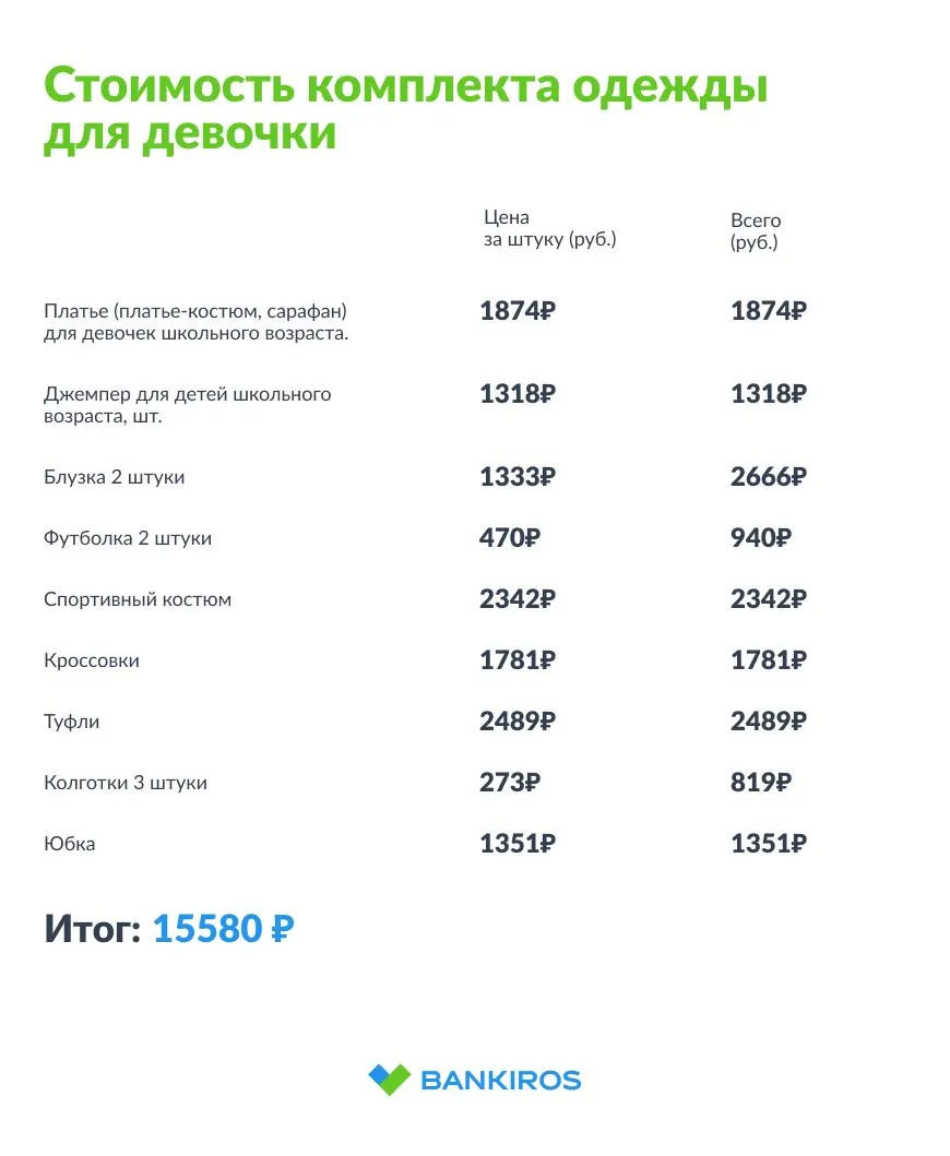 Цены на одежду были взяты из данных Росстата за июнь 2023 года (средние цены по России). Цены на канцелярские товары – частично из данных Росстата, частично из интернет-магазина, специализирующегося на торговле канцтоварами. Были выбраны товары низкой ценовой категории: то есть акварельные краски могут стоить и 61 рубль и 300 рублей, Bankiros.ru включил в расчеты по 61 рубль.