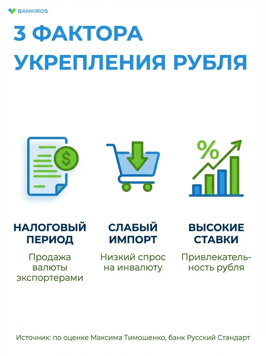 По словам финансиста, в конце месяца экспортеры начинают активнее продавать валютную выручку, чтобы рассчитаться с бюджетом. Это связано с приближением пика налоговых выплат. На этом фоне предложение иностранной валюты на внутреннем рынке растет, что поддерживает курс рубля.