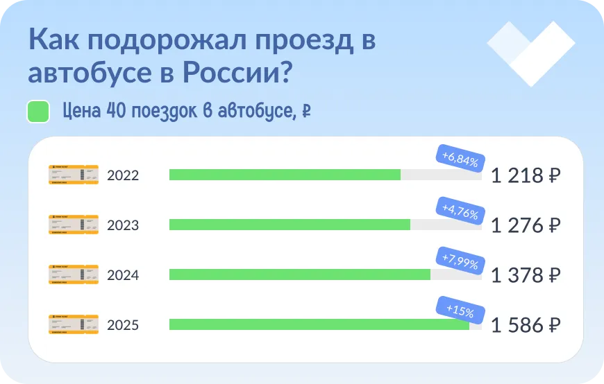 За прошедший год цены выросли на 15%, раньше россияне платили 1 378 рублей за 40 поездок. За три года рост цен составил 30,2%, в 2022 году на автобус тратили 1 218 рублей.
