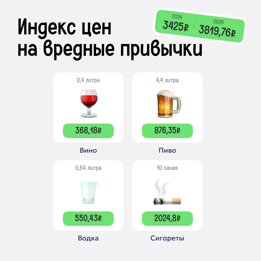 Стоимость набора вредных привычек в октябре 2025 года составила 3 819,7 рубля, а в прошлом году стоимость тех же продуктов была 3 425 рублей. Таким образом за год цена подорожала на 394,7 рубля или на 11,52%.
