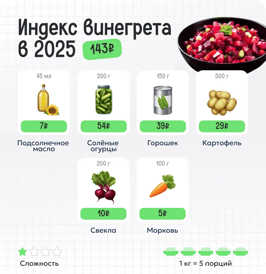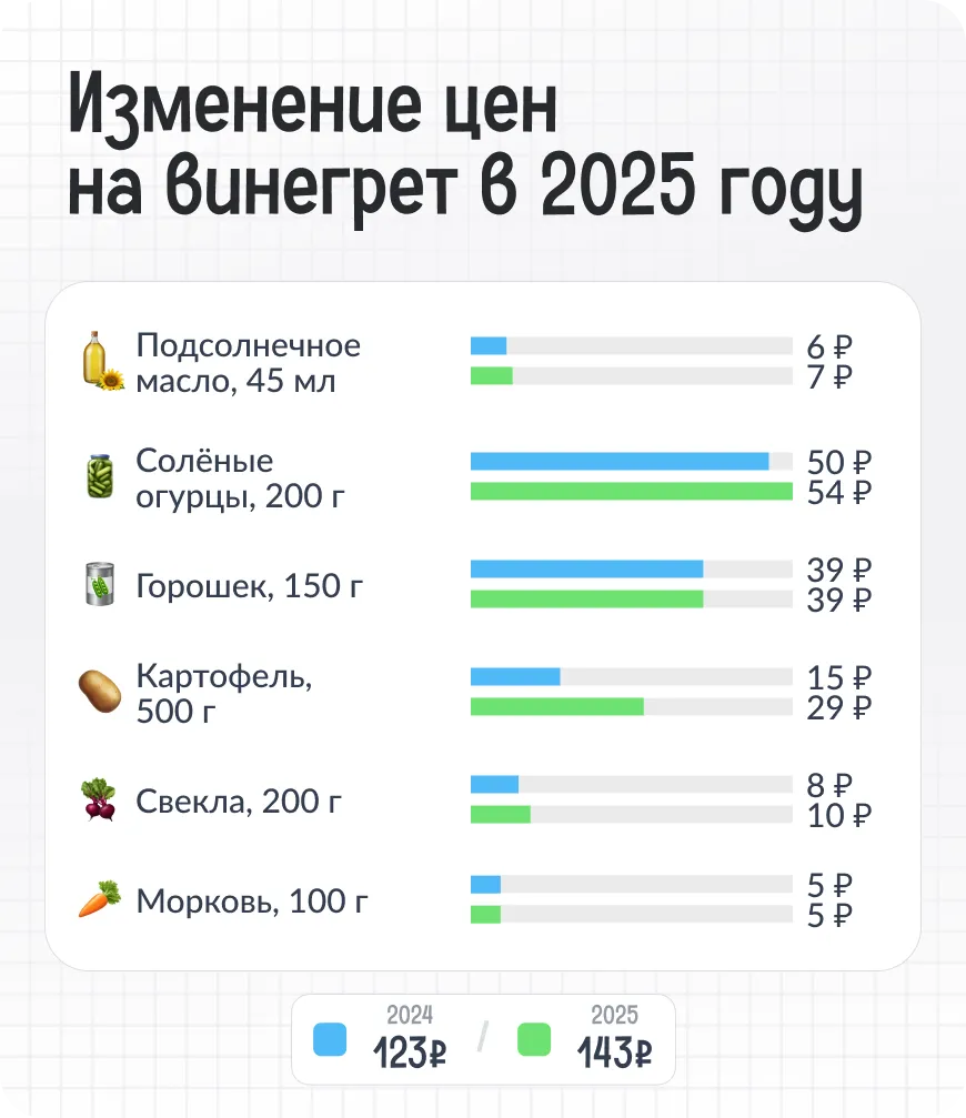 - Продукты для винегрета в России стоят 143 рубля, в 2024 году цена была – 123 рубля;