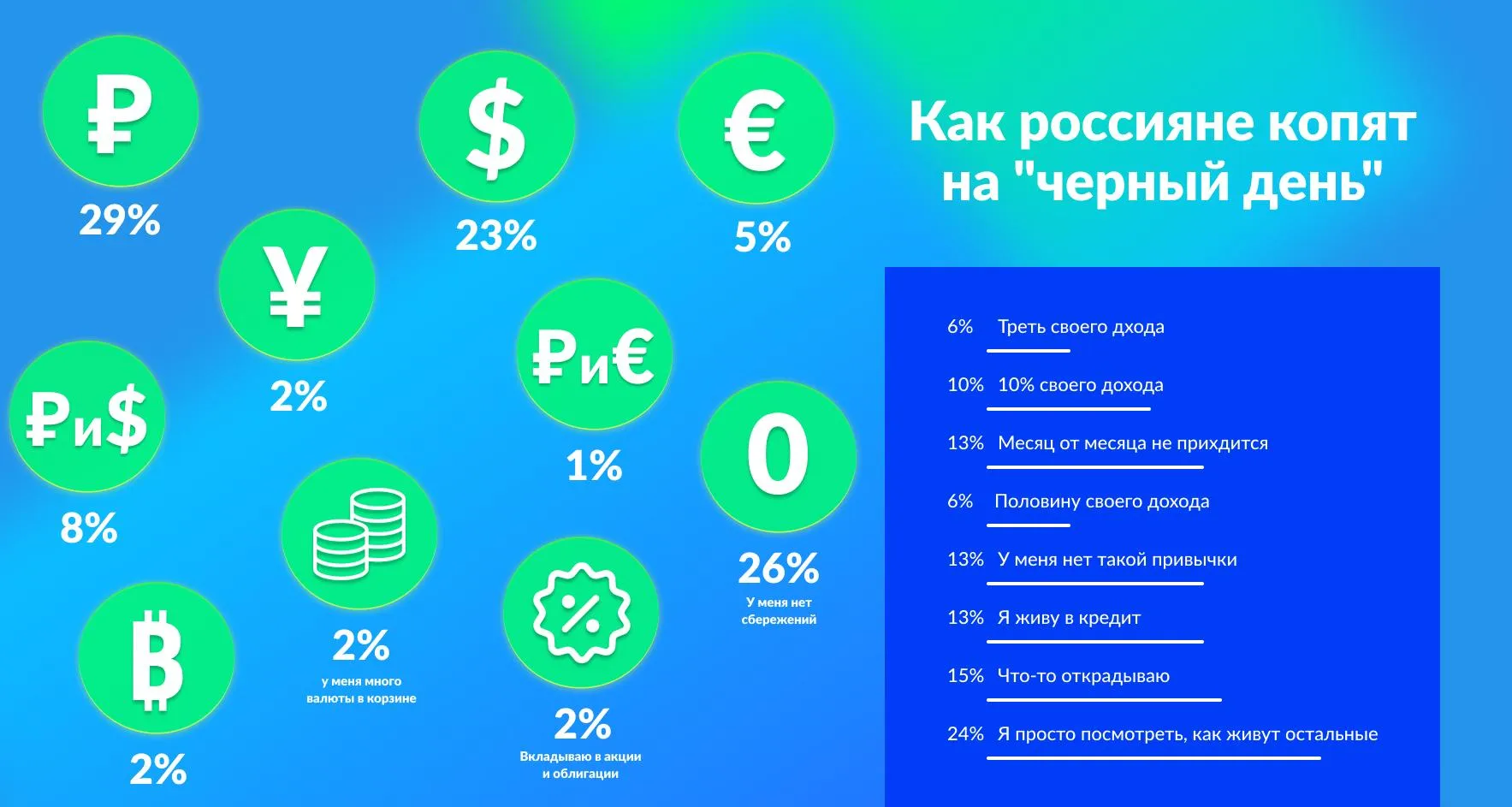 Согласно голосованию, 13% россиян жили в кредит. Но все же некоторые граждане придерживались сберегательной стратегии: