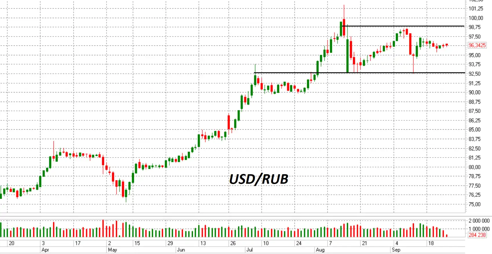Пара доллар-рубль продолжает консолидацию. Широкий диапазон 92,5-98,5 руб. за доллар в последние дни сузился до 95,5-97,5 рубля.