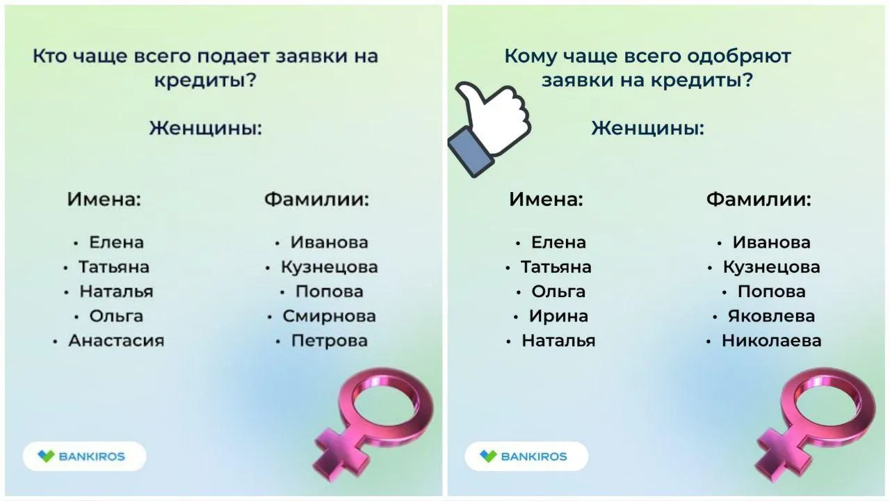 Среди представительниц прекрасного пола лидируют женщины с фамилией Яковлева и именем Ирина – им гарантированно выдают кредиты. Осторожнее стоит быть дамам с именем Анастасия и фамилиями Петрова и Смирнова, так как из заявки одобряются реже всего.