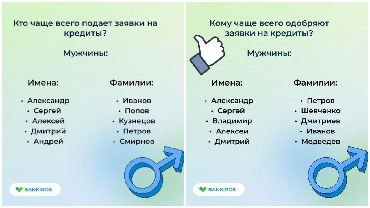 Аналитический центр Bankiros.ru изучил базу поданных и одобренных заявок на кредиты и кредитные карты и выяснил, как зовут тех, кому чаще других одобряли кредиты в 2023 году.