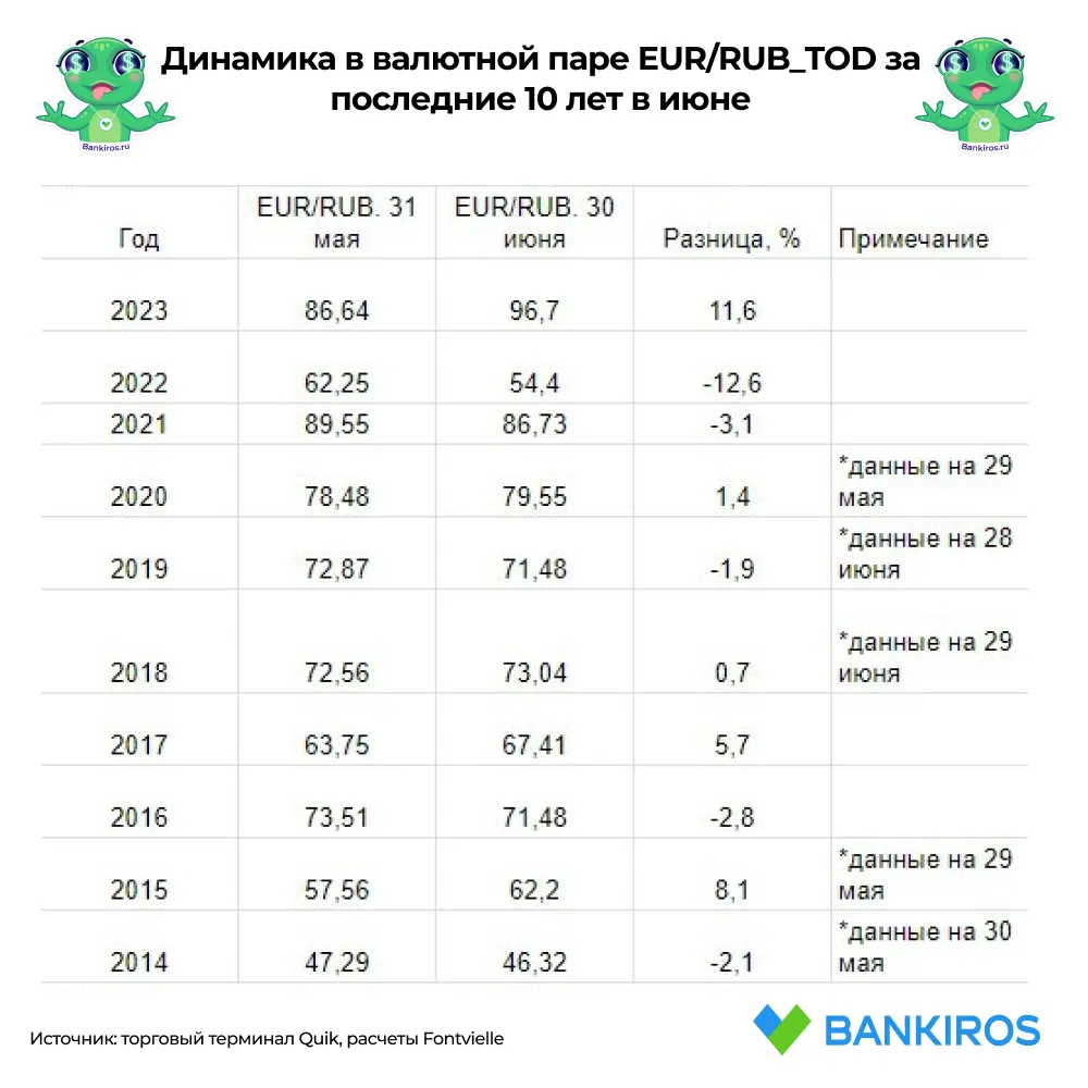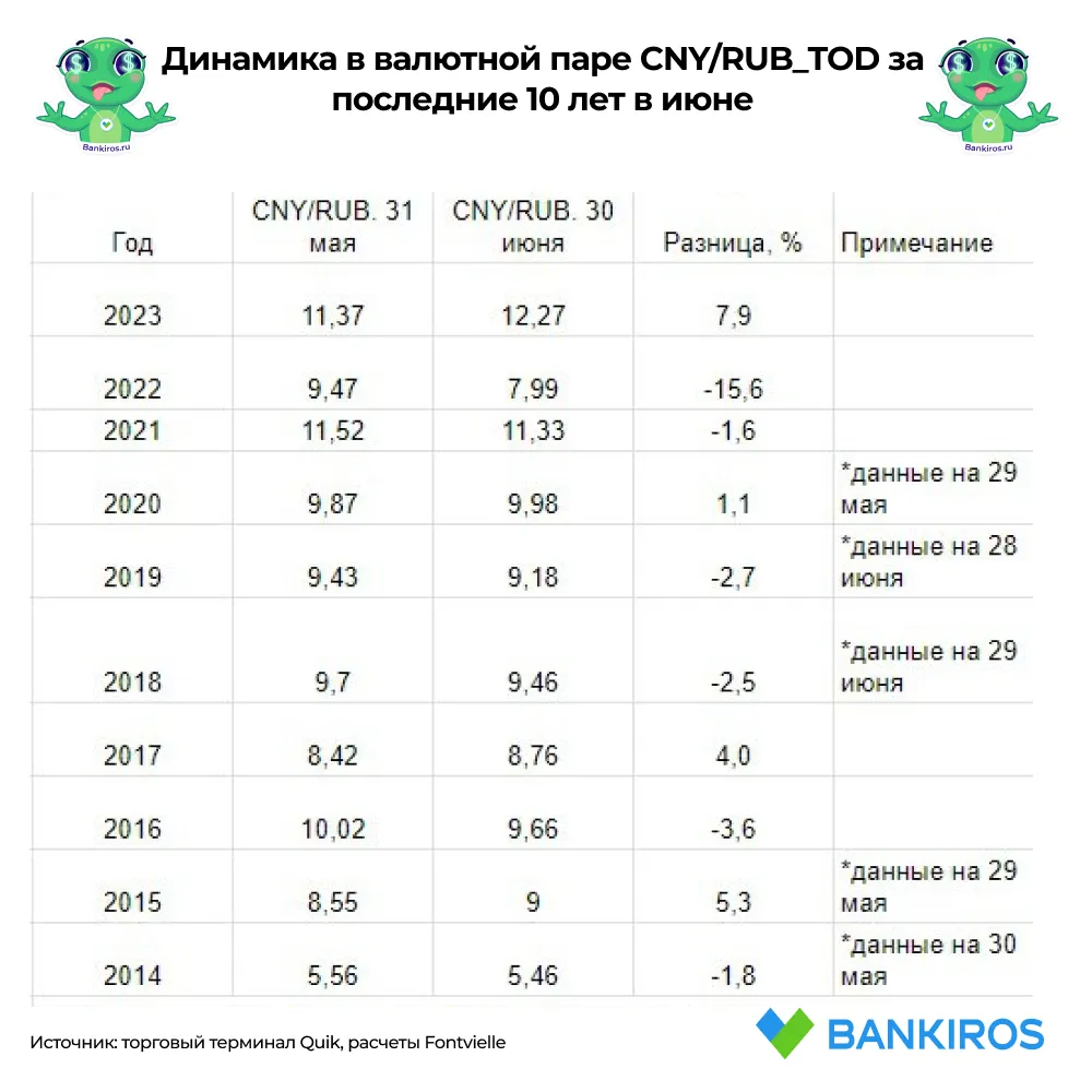 Исключением является 2018 год, когда в первый летний месяц рубль укрепился к юаню, но ослаб к доллару и евро.