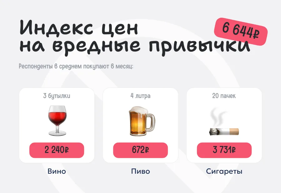 - Средние расходы россиян на алкоголь и табак составляют 6 644 рубля в месяц, включая три бутылки вина, четыре литра пива и 20 пачек сигарет;
