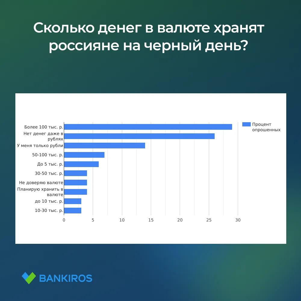 Опрос показал, что несмотря на все колебания курсов валют и экономическую нестабильность, значительная часть людей предпочитает хранить свои сбережения в валюте, при этом самые распространенные суммы превышают 100 тысяч рублей. Однако некоторые комментаторы написали, что 100 тысяч рублей – это довольно маленькая сумма.