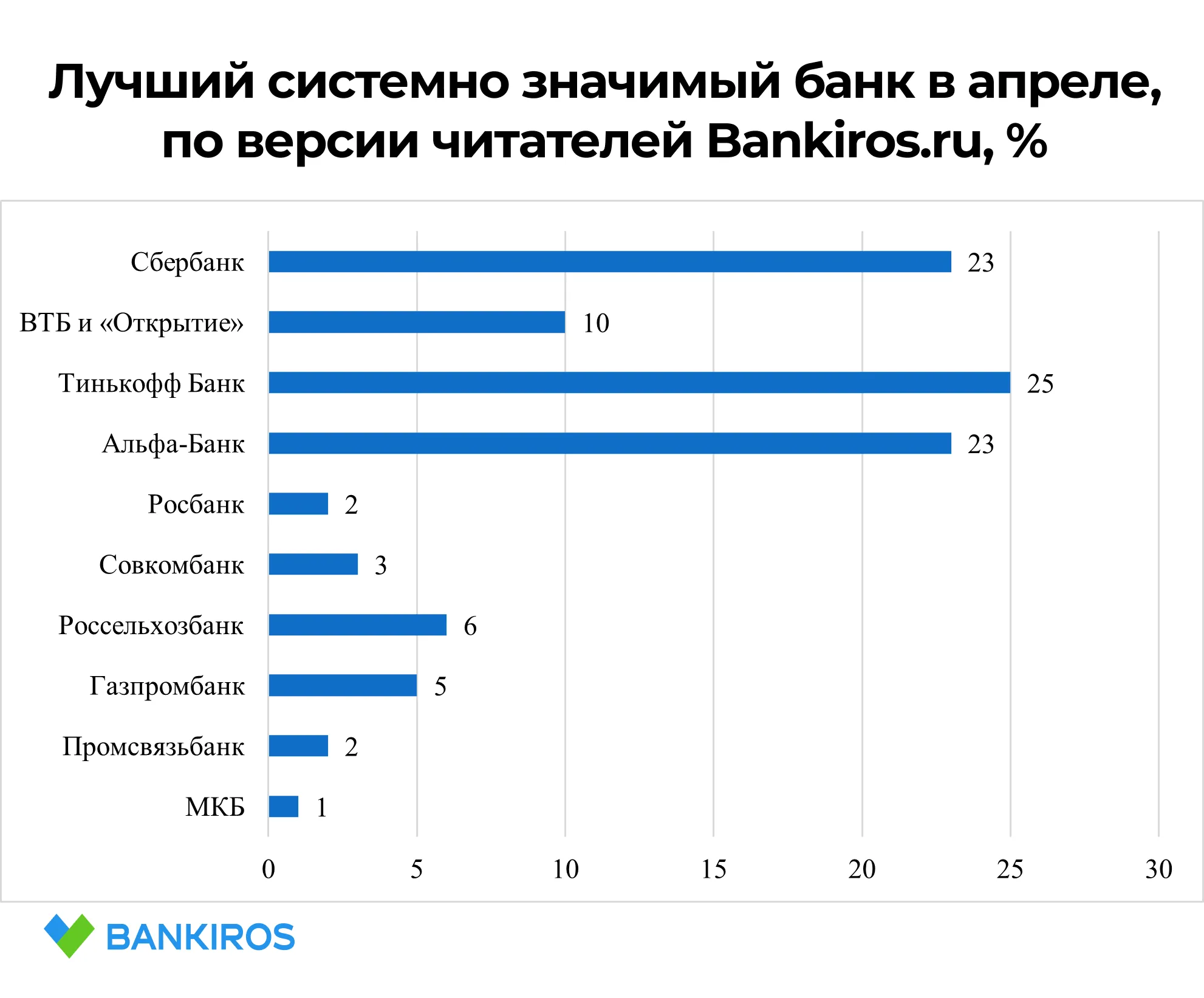 С 22 по 27 апреля Bankiros.ru провел анонимный опрос с единственным вариантом ответа среди подписчиков своего телеграм-канала. Читателей спросили: какой из системно значимых банков, на ваш взгляд, достоин звания «Лучший банк в апреле» по надежности, качеству обслуживания и клиентоориентированности? В исследовании приняли участие 1 690 человек.