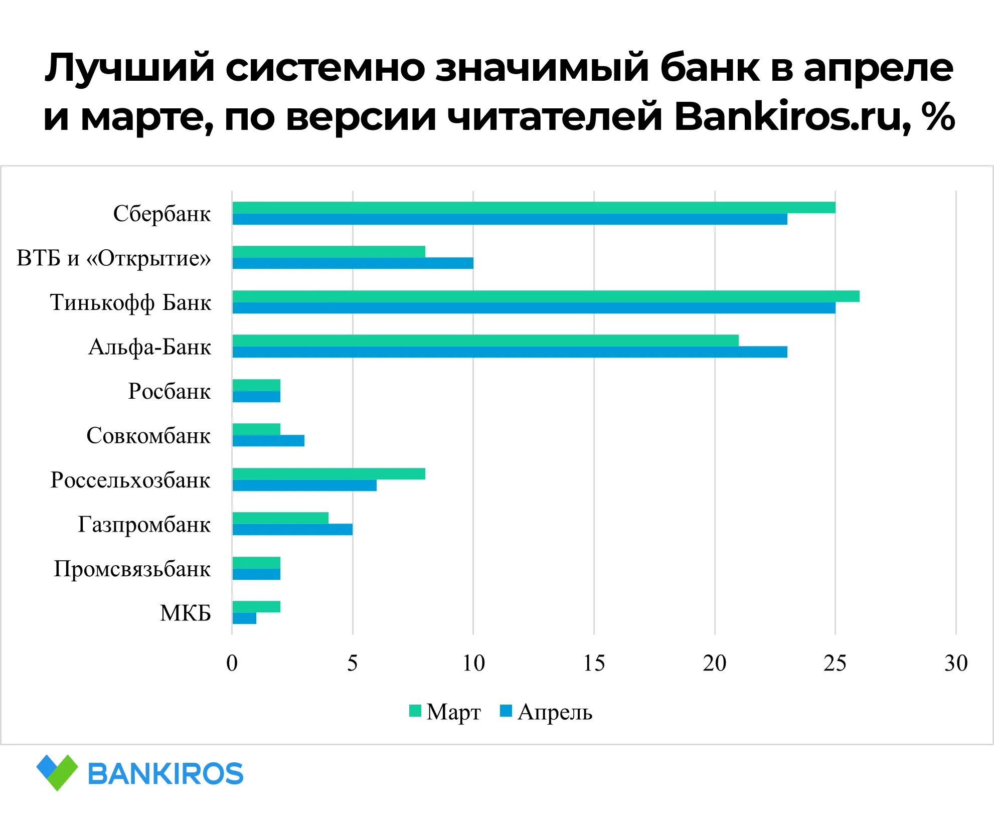 Второй месяц подряд лидером рейтинга стал «Тинькофф». Однако в апреле за кредитную организацию проголосовали меньше граждан, чем в марте – 25% против 26%.
