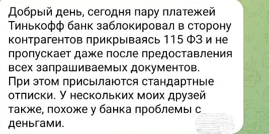 Бизнес-клиенты Тинькофф Банка жалуются на блокировки по закону 115-ФЗ.