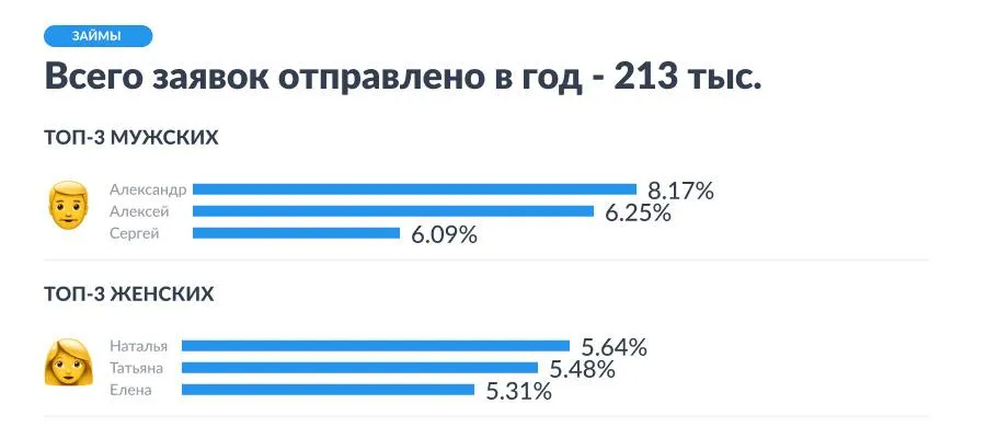 Как показало наше исследование, самые популярные имена мужчин, желающих взять кредит и заем, совпадают. Не те же эти люди? А вот у женщин статистика немного отличается – правда, на одно имя: кредиты чаще берут Елены, а займы – Екатерины.
