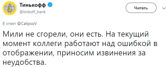 Скриншот из твиттер-аккаунта Тинькофф БанкаПредставитель Тинькофф Банка в разговоре с журналистом издания "Ведомости" подтвердил, что часть клиентов столкнулась с некорректным отображением баланса миль в личном кабинете и мобильном банке. "В ближайшее время ситуация будет исправлена", — добавил он.