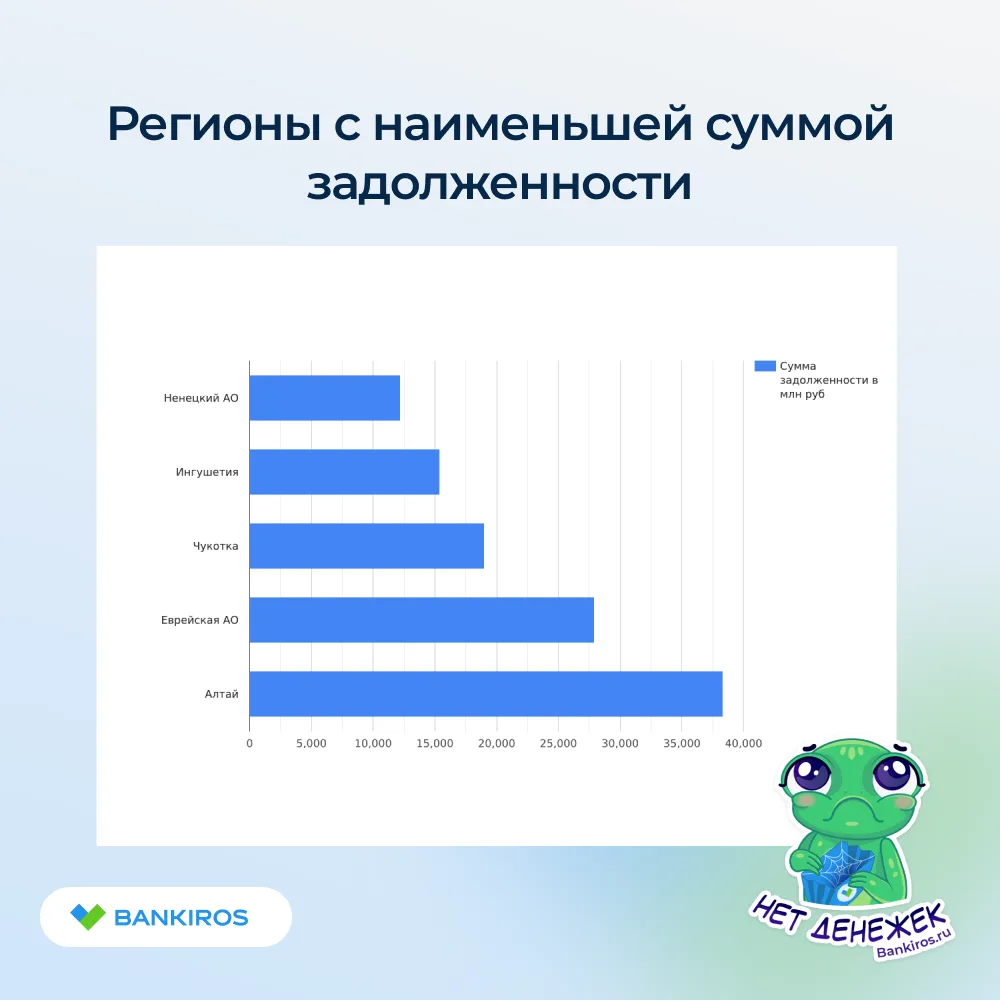 Наименьшая сумма задолженности в Ненецком автономном округе – 12 198 миллиона рублей, в Ингушетии – 15 374 миллиона рублей, в Чукотском автономном округе – 19 009 миллиона рублей, в Еврейской автономной области – 27 902 миллиона рублей, в республике Алтай – 38 314 миллиона рублей.