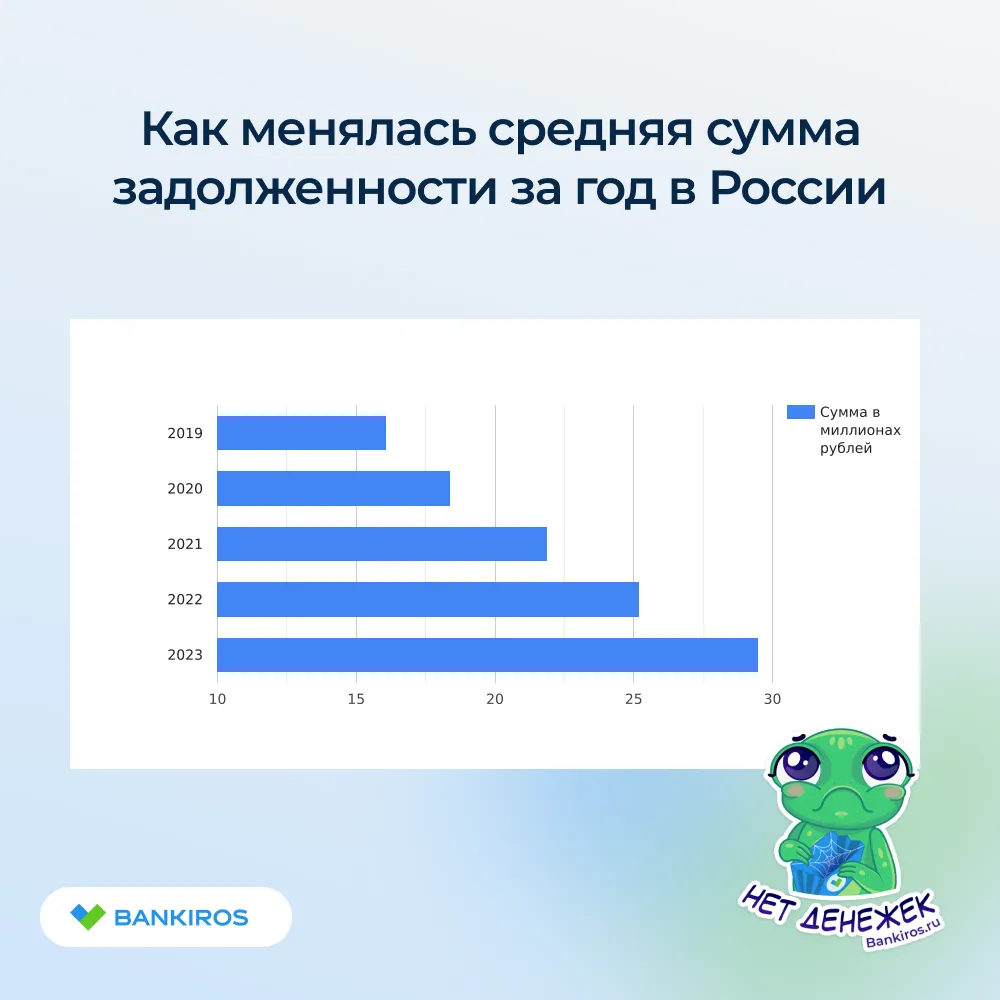Bankiros.ru посчитал среднюю сумму задолженности в России за последние годы, исходя из данных на каждый месяц с 2019 по 2023 год.