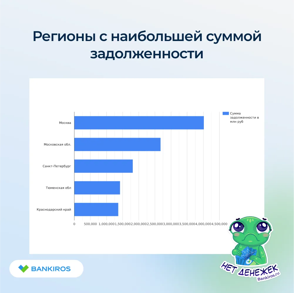 Если сравнивать только сумму задолженности, то наибольшие цифры в столице. В Москве сумма составляет 4 021 461 миллиона рублей, в Московской области – 2 677 674 миллиона рублей, затем идет Санкт-Петербург – 1 814 073 миллиона рублей, Тюменская область – 1 422 902 миллиона рублей и Краснодарский край – 1 367 917 миллиона рублей.