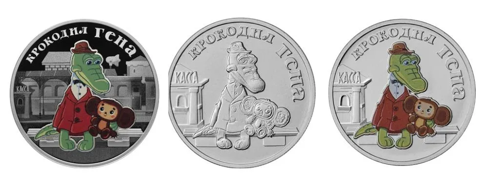 Монета из недрагоценных металлов номиналом 25 рублей в диаметре составляет 27 мм. Она немного отличается от той, что номиналом в 3 рубля. Вместо изображения вокзала рядом с героями мультиков только касса. Кроме того, таких монет два вида – с цветным изображением Гены и Чебурашки и с рельефным. «Сувениров» первого типа ЦБ выпустит 150 тысяч штук, второго – 850 тысяч штук.