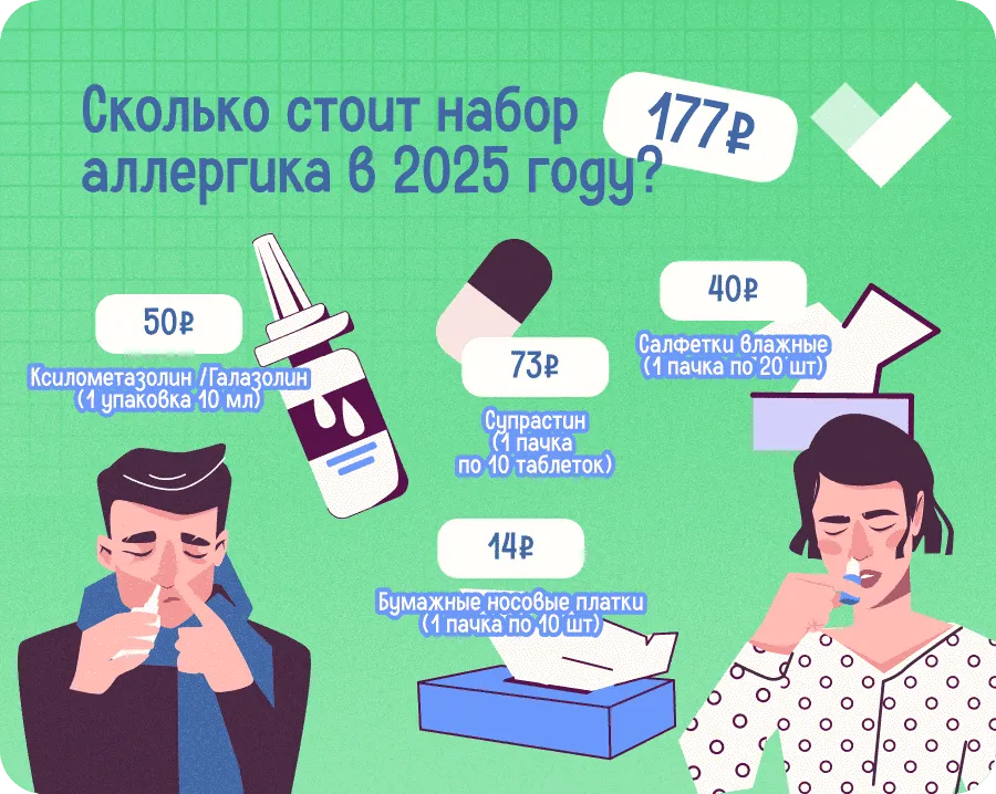- В среднем по России набор аллергика стоит 177 рублей, в него входят таблетки, спрей для носа, влажные и сухие салфетки;