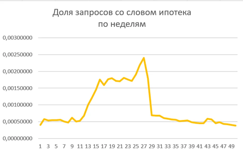 Количество запросов про ипотеку начало расти со второй половины марта 2024 года и достигло пика в первую неделю июля, что совпадает с новостями о завершении 1 июля срока действия льготной ипотеки на жилье в новостройках. В целом, интерес к теме ипотеки с середины июля в среднем в 2,3 раза ниже, чем до этой даты.