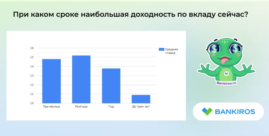 Согласно рейтингу вкладов Bankiros.ru, банки сейчас предлагают высокие ставки по краткосрочным вкладам. Исходя из анализа 10 банковских продуктов, ставка при сроке до 90-100 дней в среднем на уровне 14,8%, при сроке до 180 дней – 15,2%, на год процентная ставка уже – 13,8%, а при сроке до трех лет средняя процентная ставка составляет 10,9%. Таким образом, наиболее доходные депозиты сроком до полугода.