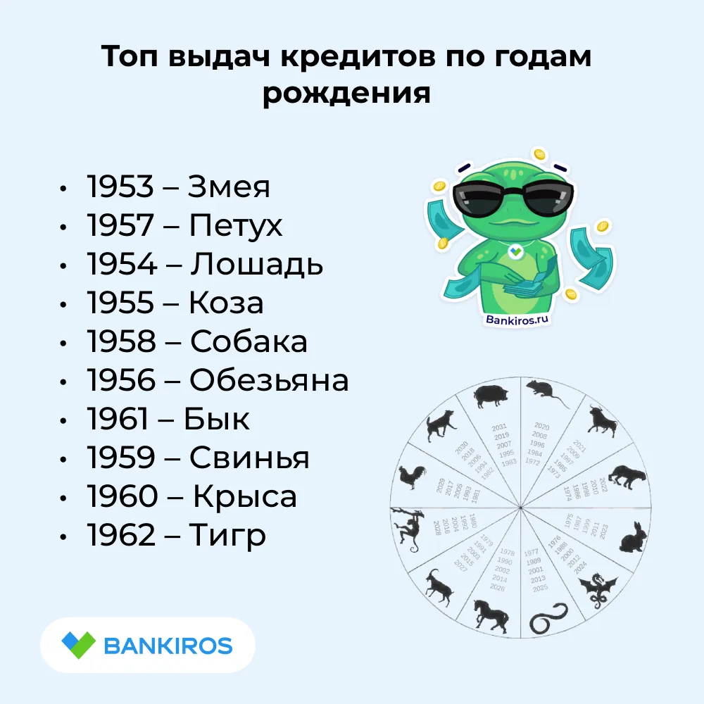 - Аналитический центр Bankiros.ru выяснил, что в первой половине года банки активно выдавали кредиты людям в возрасте 62-71 года (родившимся с 1953 по 1962 год);
