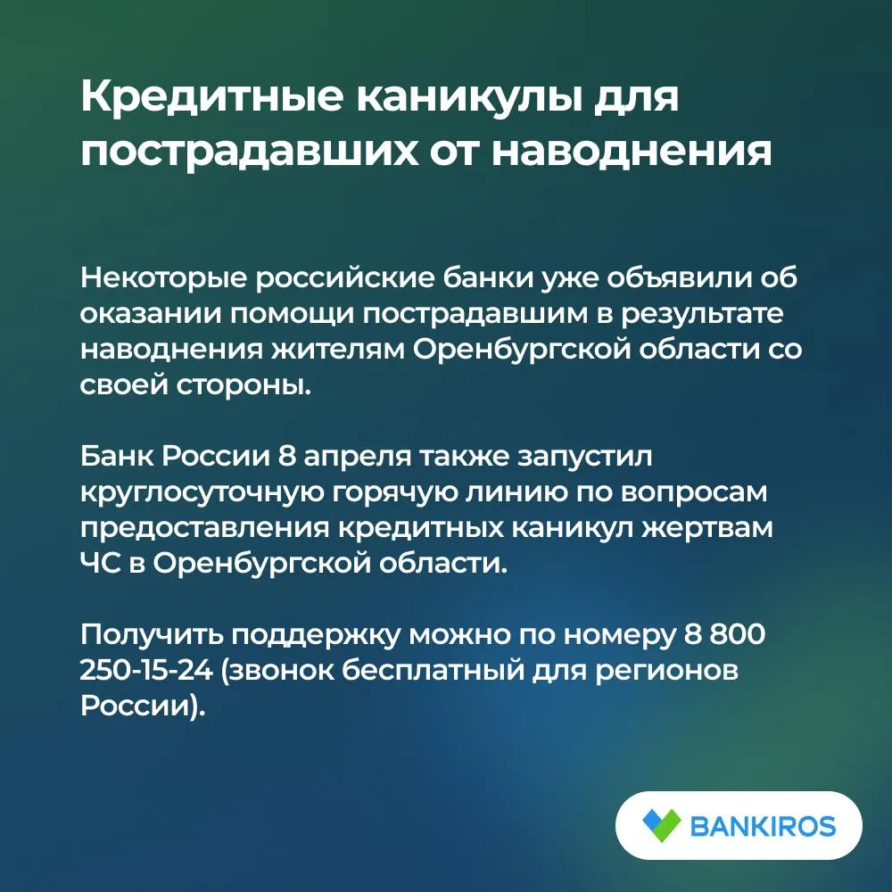 Банк России 8 апреля также запустил круглосуточную горячую линию по вопросам предоставления кредитных каникул жертвам ЧС в Оренбургской области.