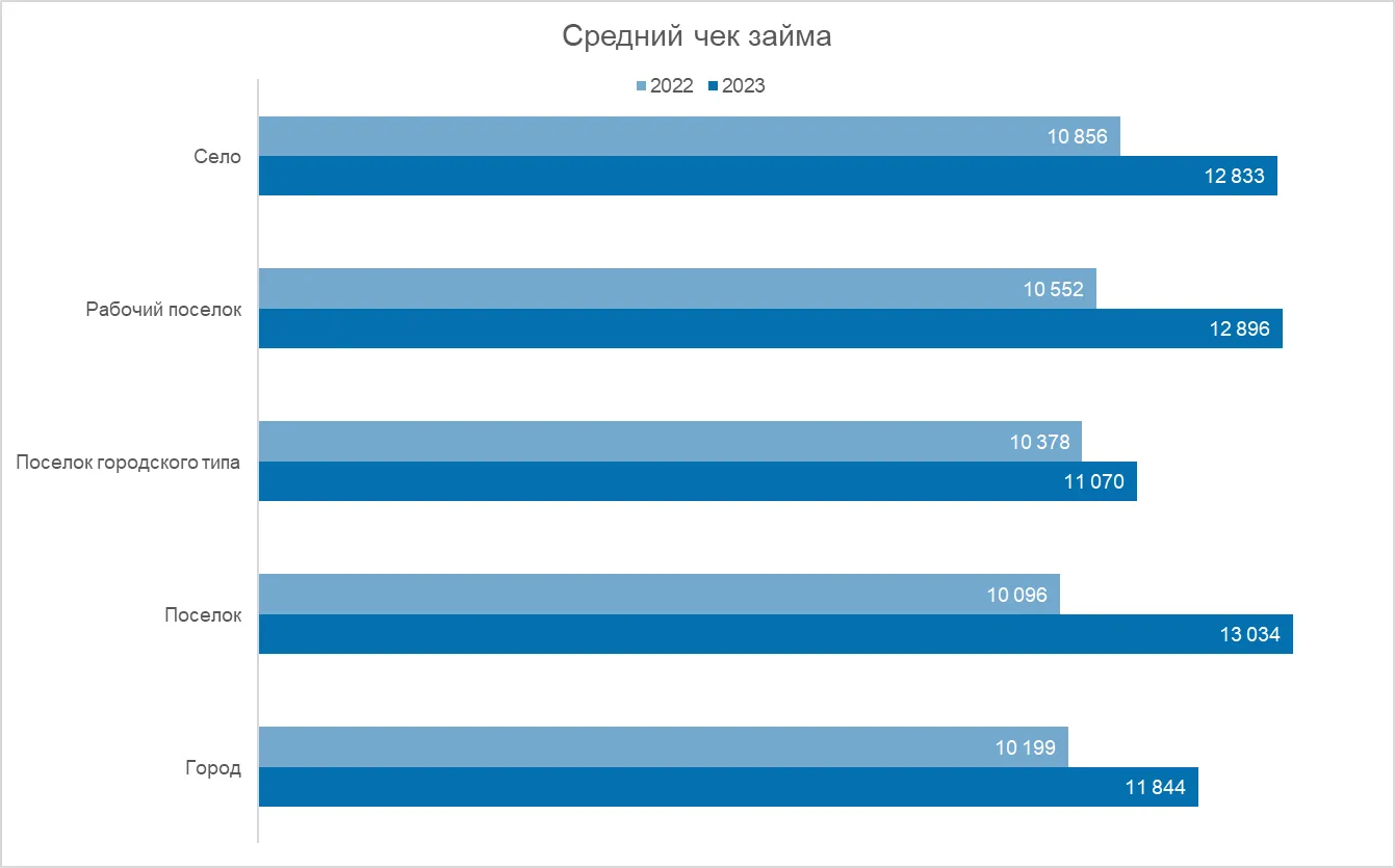 Для сравнения, в 2022 году наблюдалась совершенно другая картина – разброс между средними чеками в разных населенных пунктах был минимален, а жители поселков оформляли самые маленькие суммы (средний чек займа – 10,1 тысяча рублей). В лидерах в прошлом году находились сельские заемщики (10,9 тысяч рублей).
