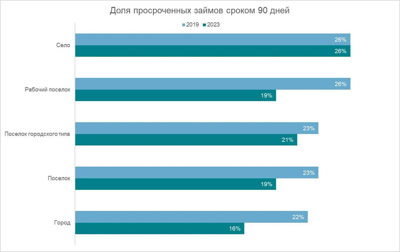 Аналитики компании изучили основные характеристики займа, такие как средний чек и частота входа в просрочку, для разных типов населенных пунктов: городов, поселков, рабочих поселков, поселков городского типа и сел.