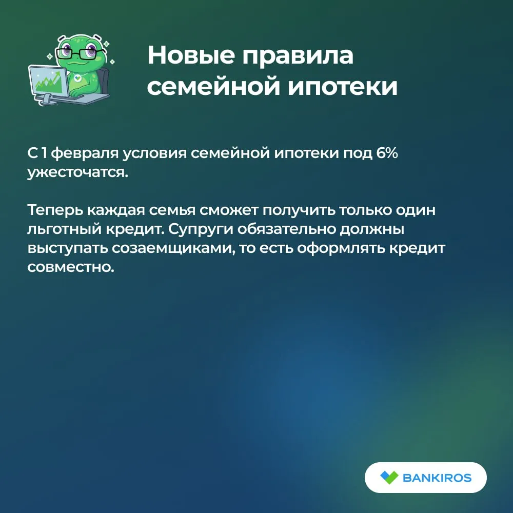 - Условия семейной ипотеки под 6% ужесточаются: одна семья сможет оформить только один льготный кредит, а супруги обязаны выступать созаемщиками, независимо от брачного договора;