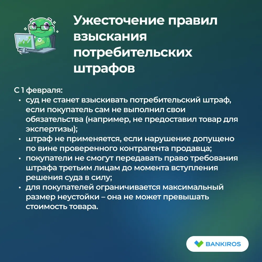 Параллельно ужесточаются требования к взысканию потребительских штрафов. Поправки в закон «О защите прав потребителей» должны снизить количество злоупотреблений и защитить добросовестный бизнес. С 1 февраля: