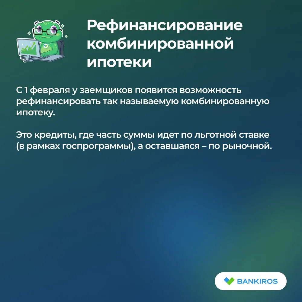 С 1 февраля у заемщиков появится возможность рефинансировать так называемую комбинированную ипотеку. Это кредиты, где часть суммы идет по льготной ставке (в рамках госпрограммы), а оставшаяся – по рыночной. Такие схемы обычно используют при покупке жилья, стоимость которого превышает установленные программой лимиты.