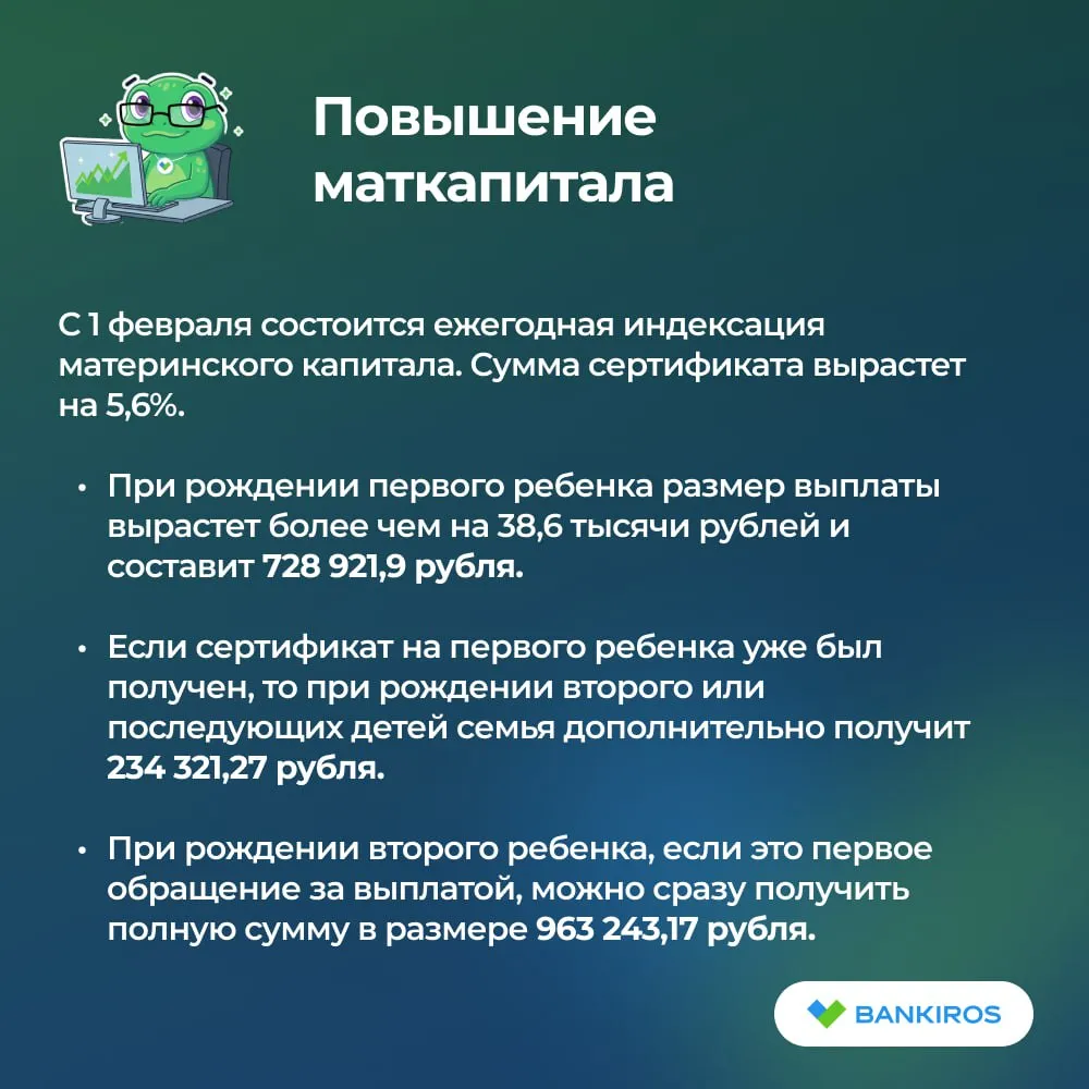 Еще одна важная новость для российских семей – с 1 февраля состоится ежегодная индексация материнского капитала. Сумма сертификата вырастет на 5,6%. При рождении первого ребенка размер выплаты вырастет более чем на 38,6 тысячи рублей и составит 728 921,9 рубля.