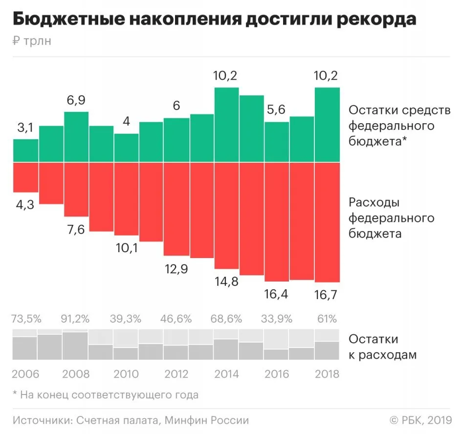 По данным Минфина, денежные остатки составили 61% бюджетных расходов. По отношению к ВВП остатки средств федерального бюджета на 1 января 2019 достигли почти 10%.