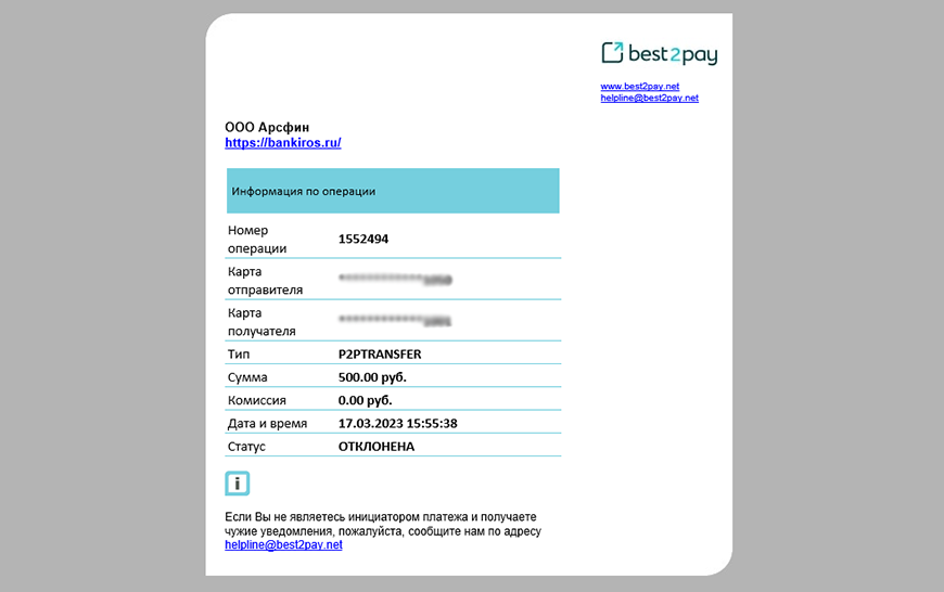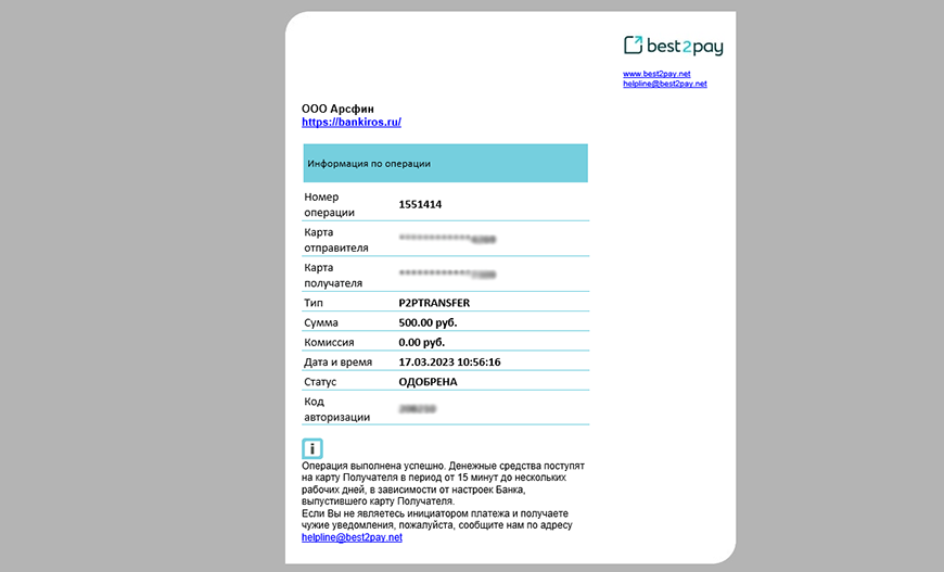 Если перевод с карты на карту выполнен успешно, уведомление об операции получит и отправитель, и получатель средств. Но при условии, что оба адреса электронной почты указывались при вводе реквизитов. В сообщении будет прописан номер операции, время ее совершения, сумма перевода, размер комиссии.