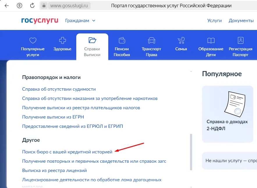 - Войдите в учетную запись на портале Госуслуги и во вкладке «Справки и выписки» нажмите «Поиск бюро с вашей кредитной историей».