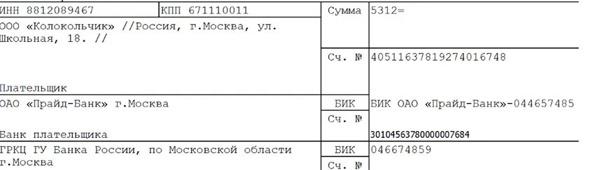 - Блок об адресате. В верхней части располагается поле для банка получателя, а слева его БИК и номер счета. В поле «ИНН» следует вписать индивидуальный номер компании-адресата, а рядом КПП.
