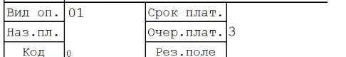 - Сведения о платеже. Вид оплаты всегда 01, поэтому это поле нужно оставить без изменений. Назначение платежа нужно заполнять только в случае, если перевод направляется физическому лицу. Вместо кода «0» при необходимости следует написать УИН. Поле «срок.плат.» не заполняется. В очередности платежа ставят цифру от 1 до 6 по ГК РФ, определяющую порядок списания средств по счету. Резервная строка также не заполняется.