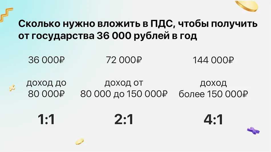 Софинансирование от государства продлится 10 лет. Чтобы получать кешбэк, нужно перечислять в ПДС не менее 2 000 рублей в год. Максимальная сумма софинансирования 36 000 рублей в год. Но для этого участник должен вложить не меньшую сумму, точный размер зависит от его доходов.