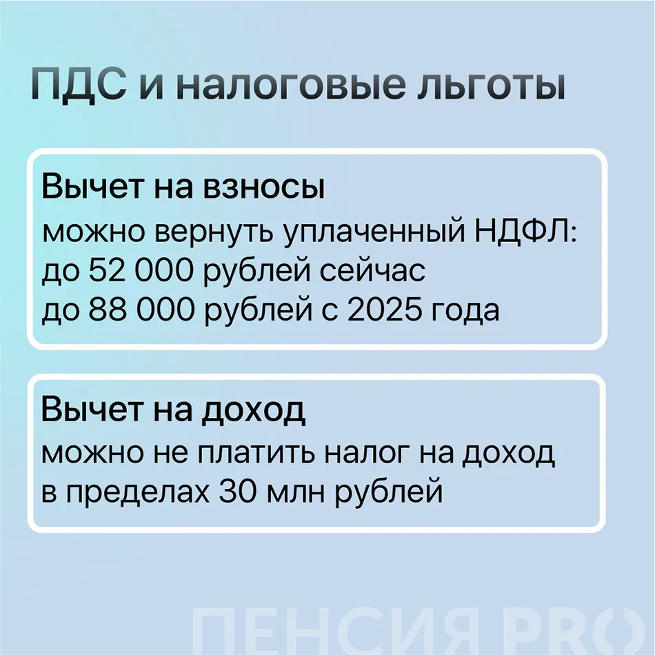 В общих чертах все работает так: вы вносите средства на счет в НПФ, государство добавляет свою часть из бюджета, НПФ инвестирует, после окончания действия договора вы получаете накопленную сумму. На счет по ПДС можно перевести накопительную пенсию, также программа попадает под инвестиционный вычет, за год вернут до 60 000 рублей.