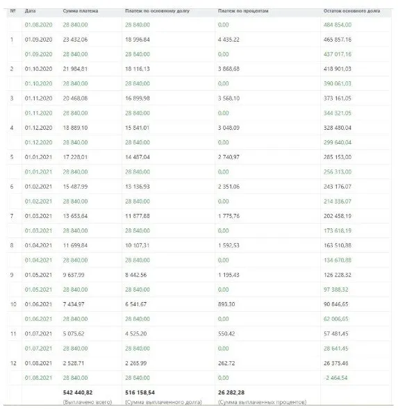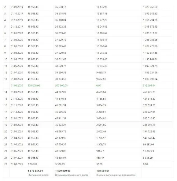 Прибегнуть ко второму способу — пересчету платежа — выгодно прежде всего тем заемщикам, которые хотят уменьшить ежемесячную нагрузку на бюджет. В ту же дату 01.08.2020 молодая семья вносит 500 000 рублей, чтобы минимизировать транши банку. Расчет: