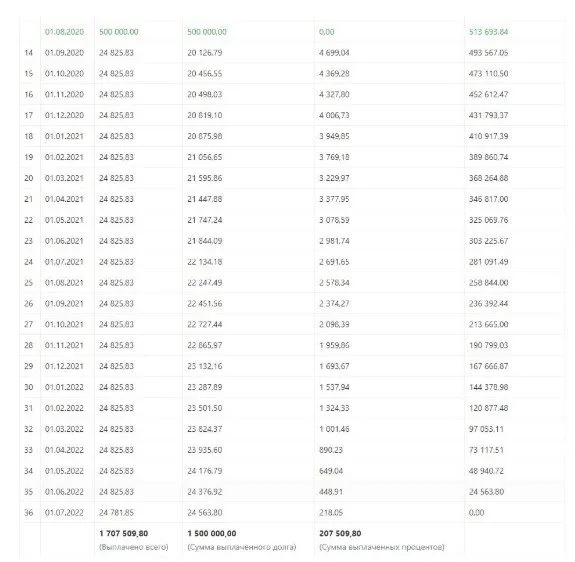 Как видно из нового графика, срок кредитования сократился почти на год — с 36 до 25 месяцев — при том, что сумма ежемесячного платежа осталось прежней. Итоговая переплата по кредиту составила 178 554 рубля.
